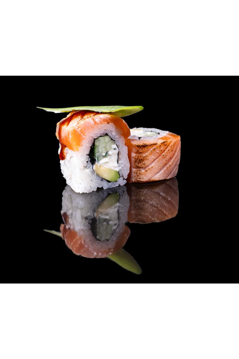 Laks, philadelphia ost, avokado, agurk, vårløk, japansk saus. Inneholderr: Melk, fisk, soya, hvete, sennep