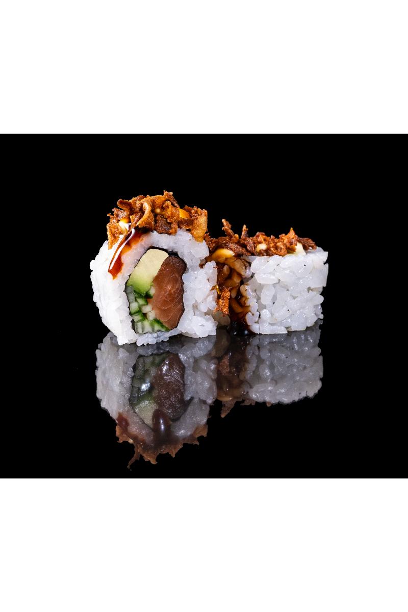 Laks, avokado, agurk, majones, sprøstekt løk, teriyaki saus. Inneholder: Fisk, hvete, egg, soya, sennep