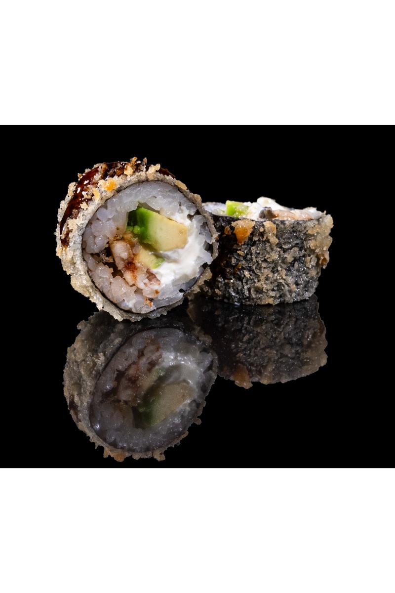 Røkt ål, philadelphia ost, avokado, teriyaki saus. Inneholder: Fisk, hvete, melk, sennep, soya, sesam