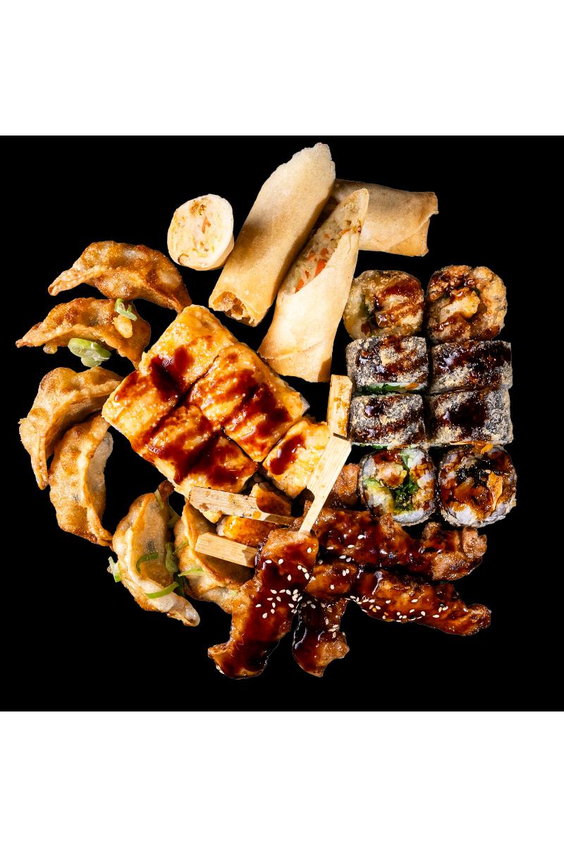 Crunch Chicken maki, Hot Chicken maki, 6stk Dumplings med kylling, 2stk Vårull, 4stk Kylling Yakitori. Inneholder: Hvete, soysa, egg, sesam, sennep