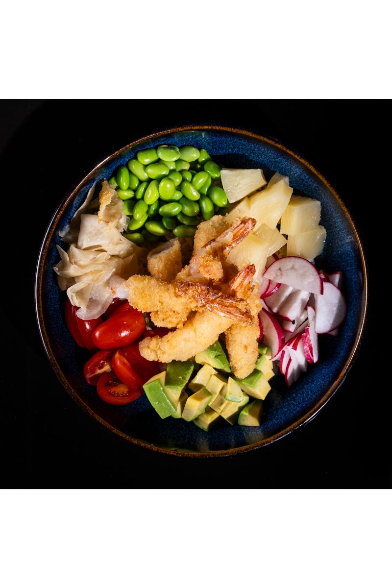 Tempura scampi, ris, ananas, avokado, soyabønner, cherrytomater, ingefær, reddik, sesamfrø, yasai saus. Inneholder: Skalldyr, sesamfrø, sennep, soya, hvete.